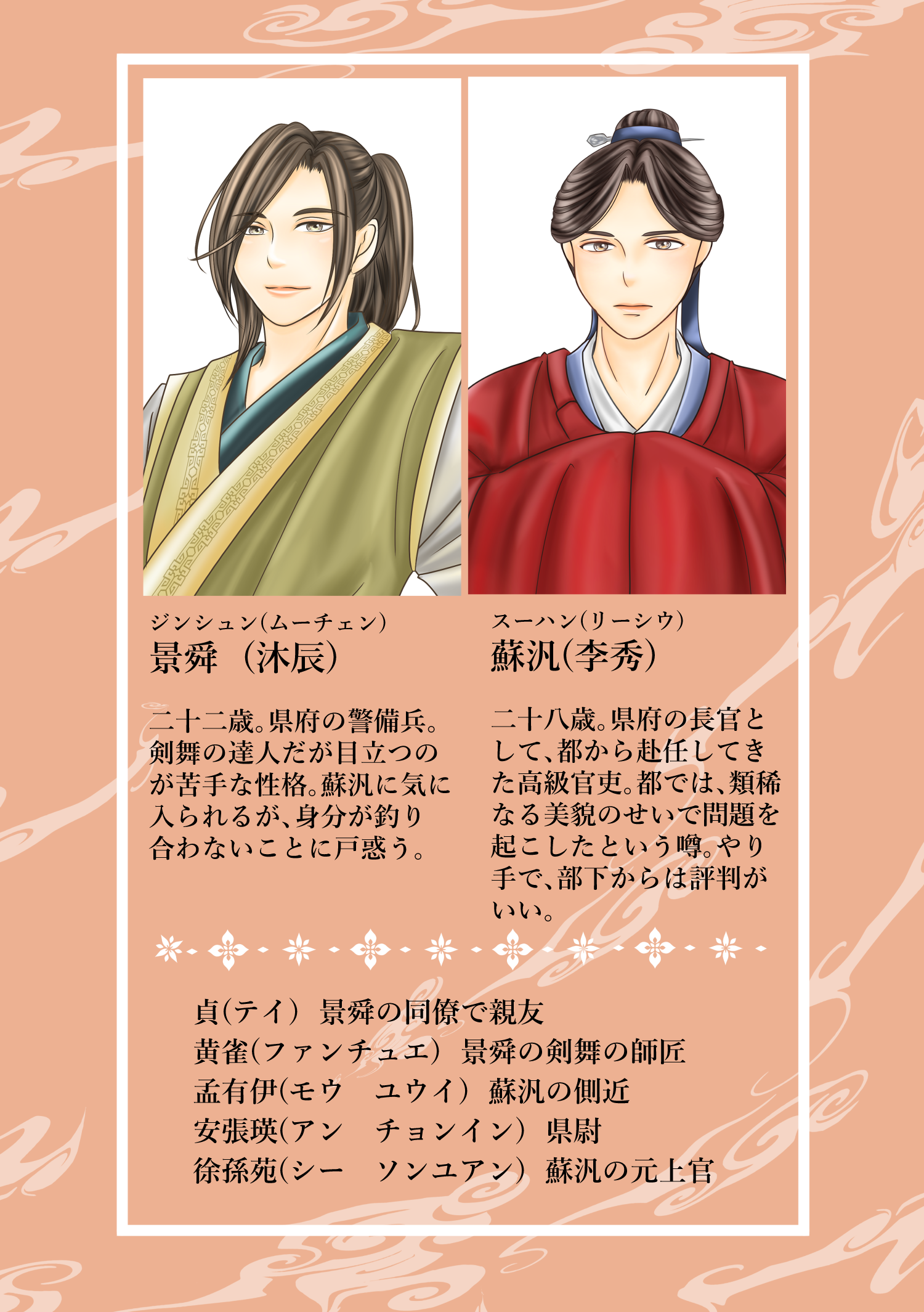 箸でつまんだ肉団子をほおばり、その声に顔をしかめた景舜である。景沐辰とは彼のことで、舜は彼の名である。貞は同期で仲がいいので名で呼ぶが、公的には字(あざな)の沐辰で呼ばれる。