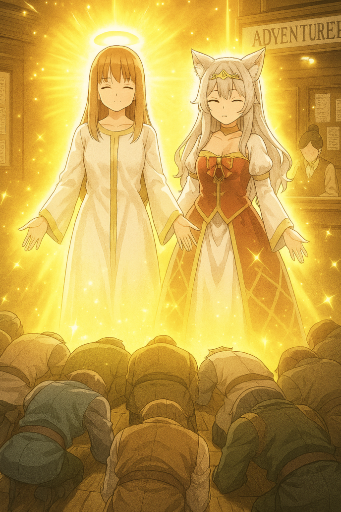 ミサエさんとダリナの二人は聖女の衣装でギルドに戻り、聖女の魔法・ホーリーライトを使って体を金色に光らせた。
