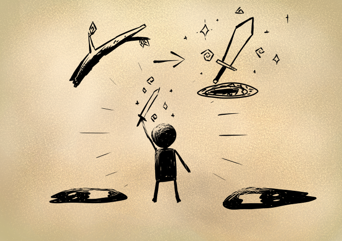 男は近くの木から一本の太い枝を折ると、不思議な力で一振りの剣に変え、化け物たちを瞬く間に倒していったのです。
