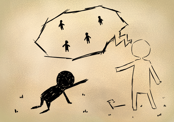 これは昔々、おじいさんも、そのまたおじいさんもまだ生まれていないくらい昔のお話。あるところに一人の男がいました。男が住んでいたところにはその男の他にはだれもおらず、いつも寂しい思いをしながら暮らしていました。