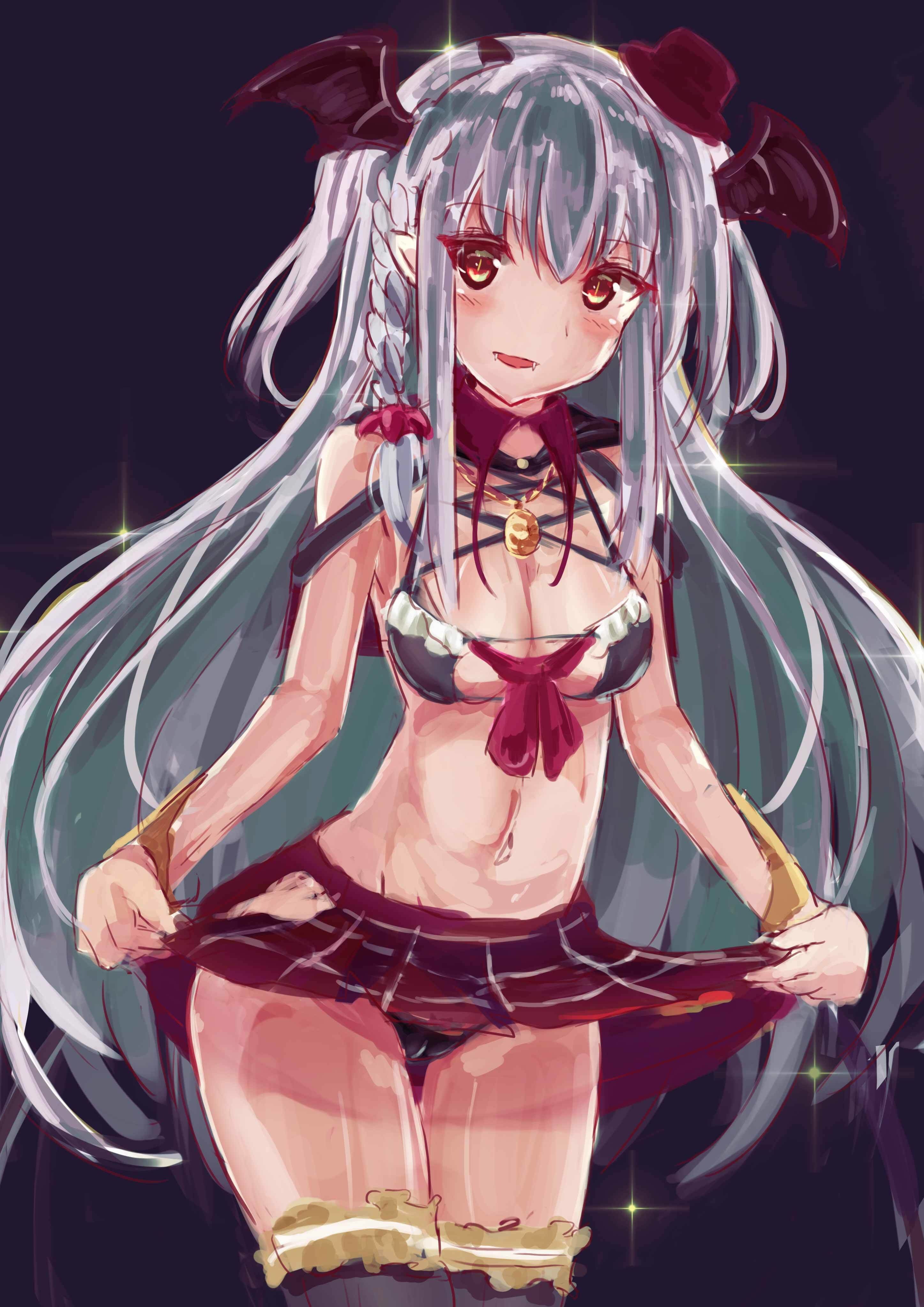 彼女は月光の下でキラキラと輝く銀髪の髪を靡かせ妖艶な笑みを浮かべ笑ったのだった。リボンのついた黒いビキニに小さな黒いマント、赤いミニスカートに膝までのブーツ、頭には蝙蝠の羽の様な角が生えている。