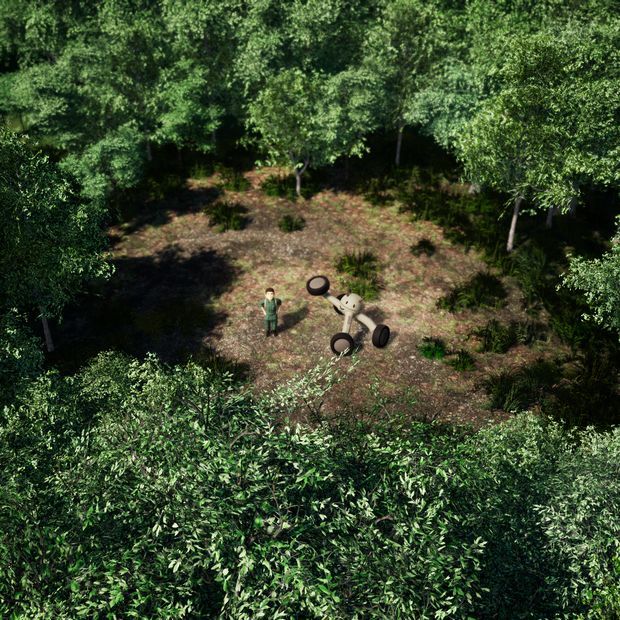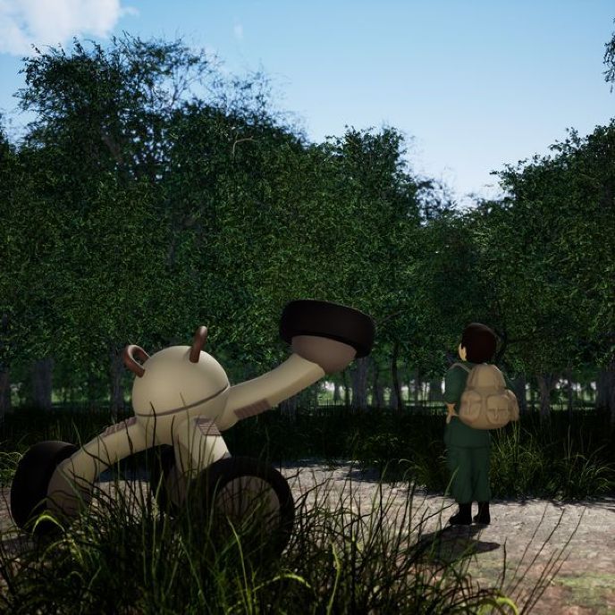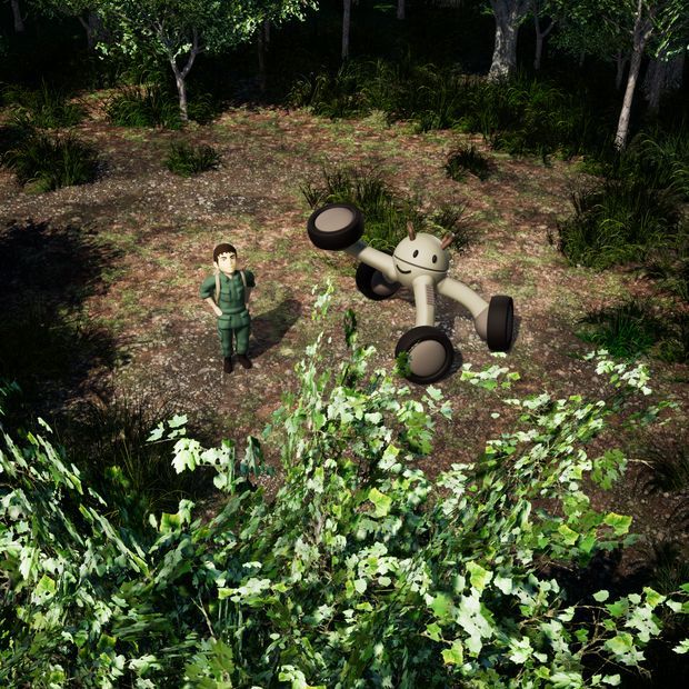 走行モードに移行したテットの頭に乗っかるエレノア。ちょっとうらやましい。テットはボディの各部を堅くしたり柔らかくしたりと色々と融通の利く不思議な材質でできている。エレノア曰く、乗り心地はまぁまぁだとか。