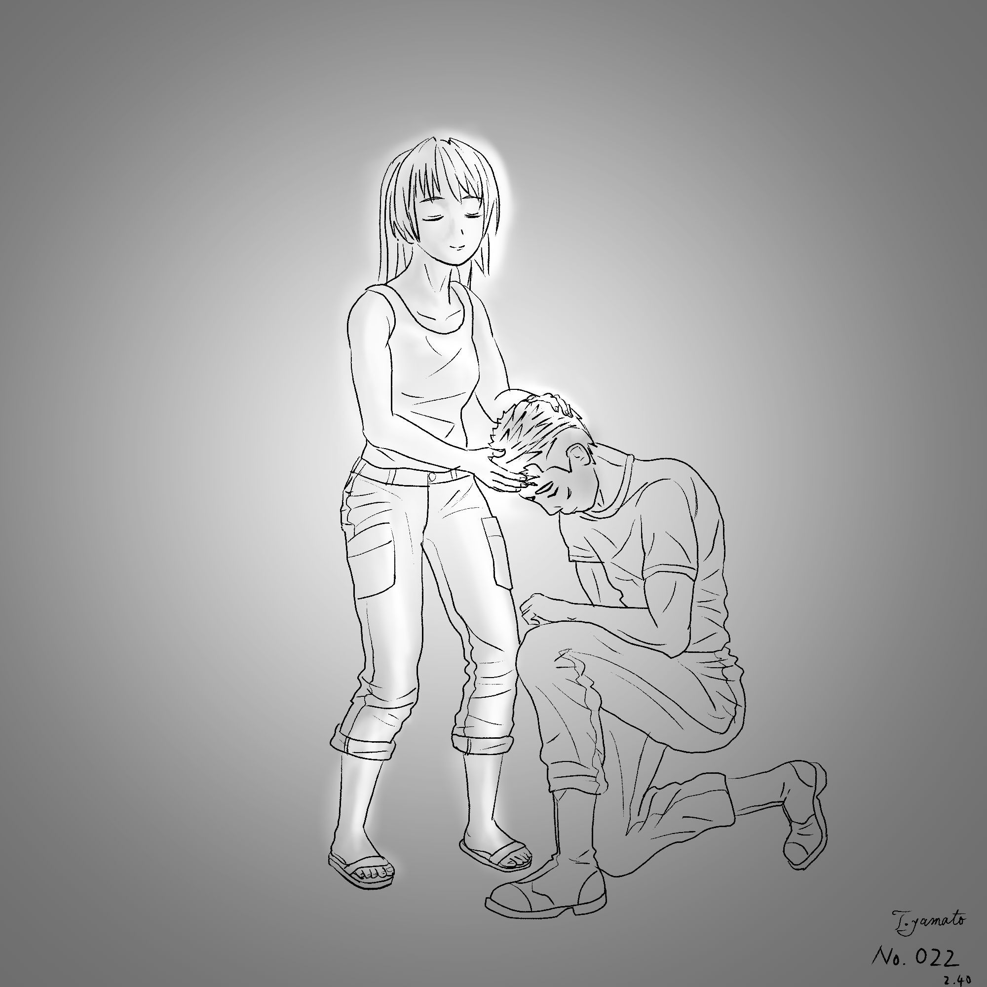 エレノアはアッシュにゆっくりと近づき、そっと右手を額に当てる。そして左手を後頭部に当てる。両手でアッシュの頭を包み込む。そしてゆっくりと目を閉じ、深呼吸を開始。