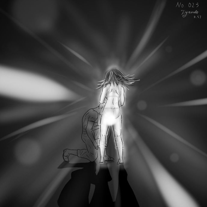二人は茂みの奥へ…というのは夜の山ではちょっと危険なので、たき火の光が回り込まないテントの影へ。テントの影に入り、お互いの姿がうっすらとしか見えない状況。アッシュがエレノアに近づく。エレノアに対して90度ターンしてしゃがみ込むアッシュ。騎士が忠誠を示すかのような姿勢で頭を垂れる。