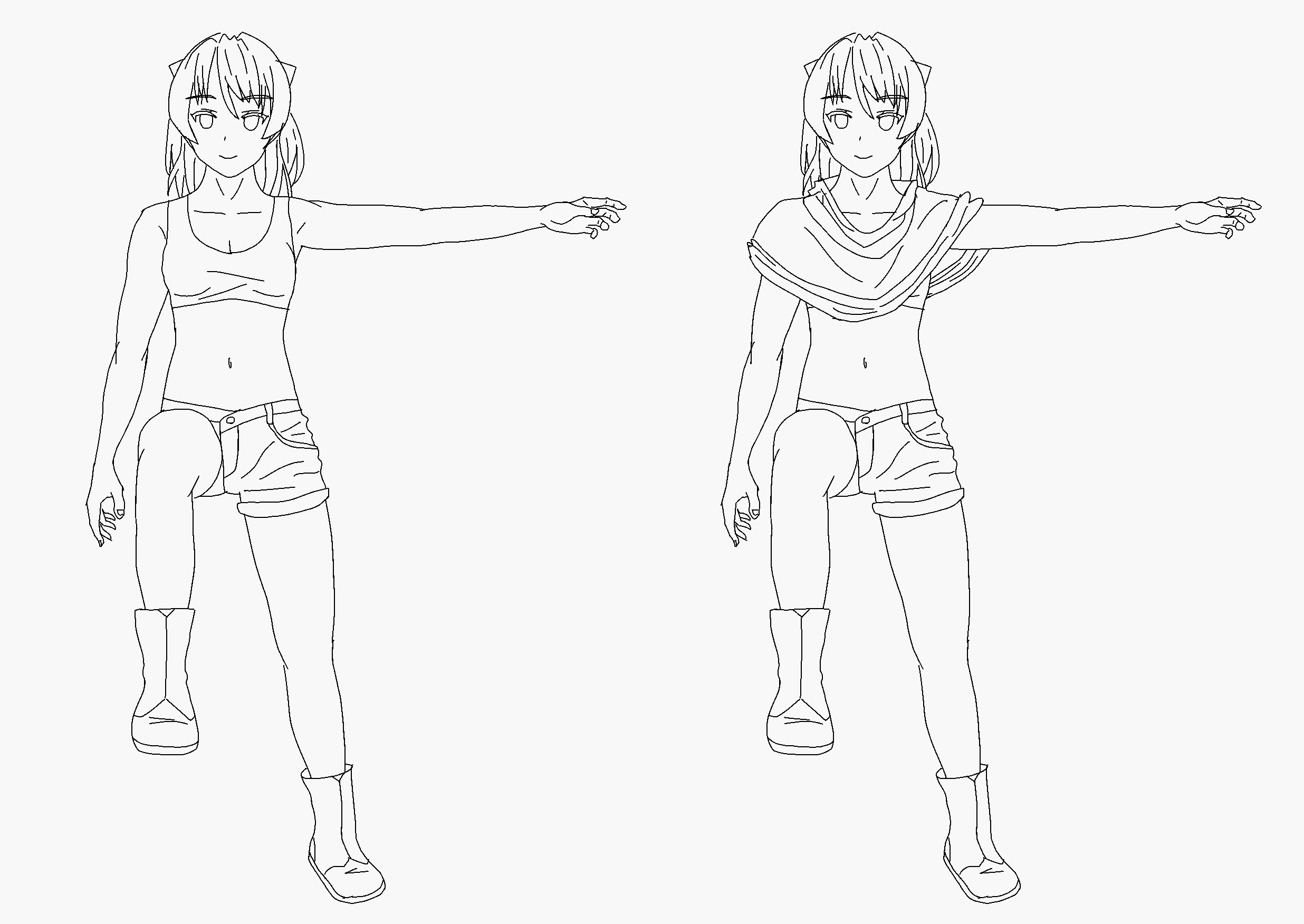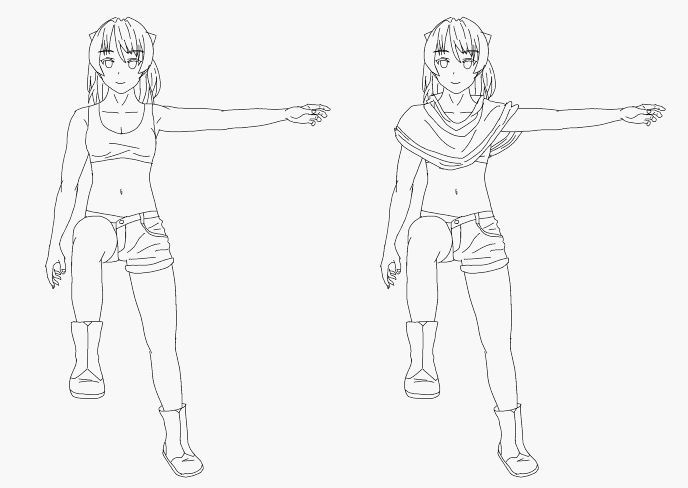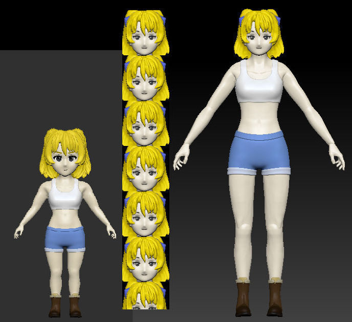当初は6.5頭身のリアル頭身。なので線画はリアル頭身で描かれている。3DCGによる挿絵作りでも最初のテストではリアル頭身でモデリング。