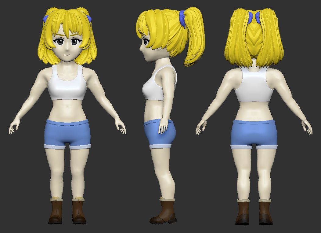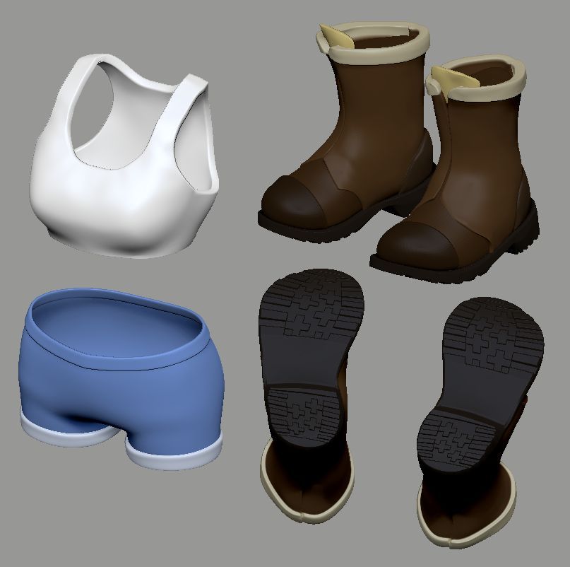 ブーツもリアル路線であったときのモデルを流用してサイズ調整。他の衣類は情報を丸めてシンプルなデザイン。なのでブーツだけが妙にリアルで手間がかかったデザインになっている。