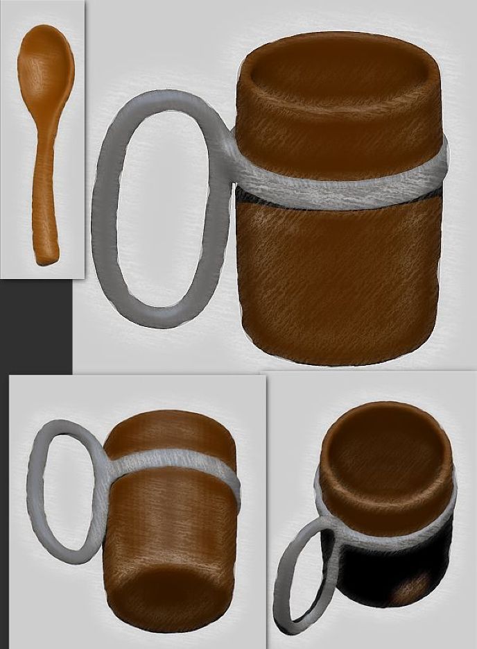 物語の設定としては、電気がない世界という設定だから、木材中心なのだ。そして金属も貴重なものという設定。軍務に従事している場合の野営地装備品。カップは木質なので消耗品。劣化したら交換するが取っ手は金属製なので使い回す。金属は貴重品という設定。
