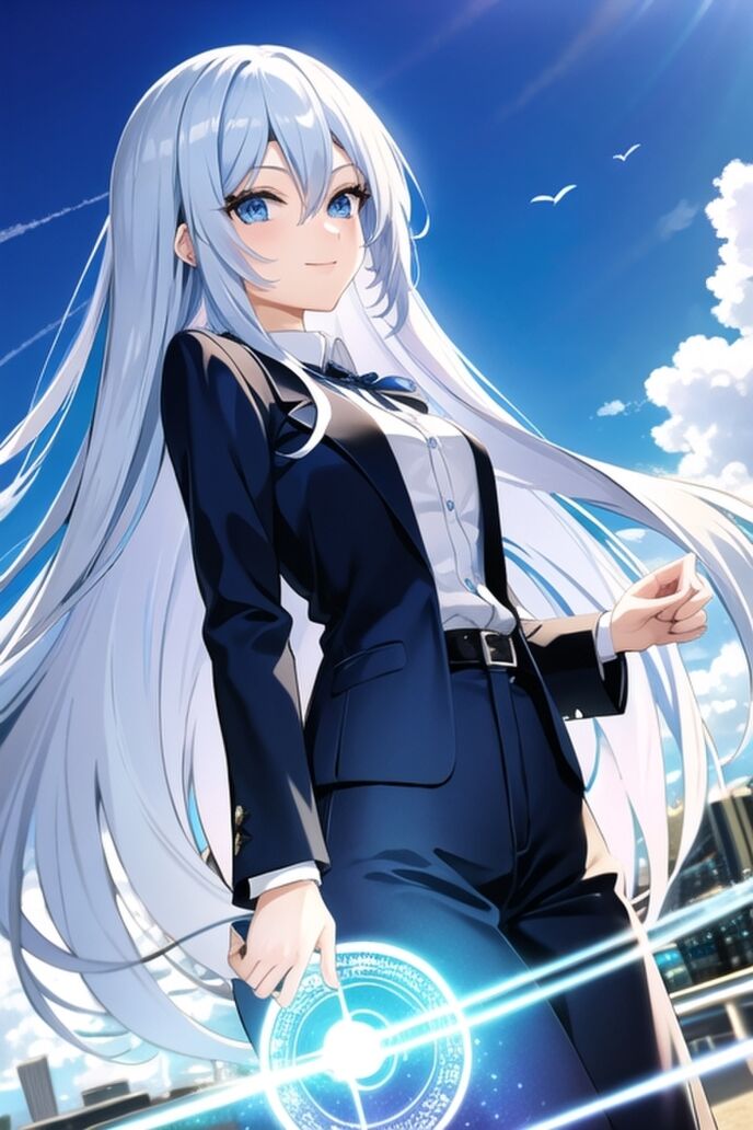完成したロボットは想像以上の出来栄えだった。青く長い髪が特徴的で、執事服を纏った女性型ロボット。マフユ専属護衛として設計されたためか、彼女を連想させる凛とした佇まいがある。