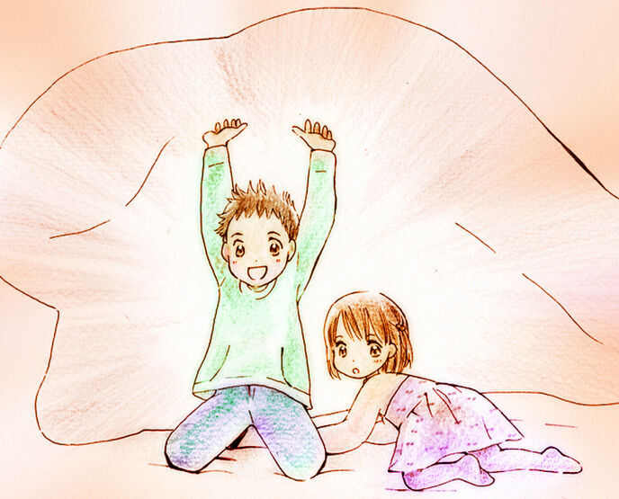 おにいちゃんのかけ声と一緒に、いきおいよく跳ねのけられたのは、お布団。