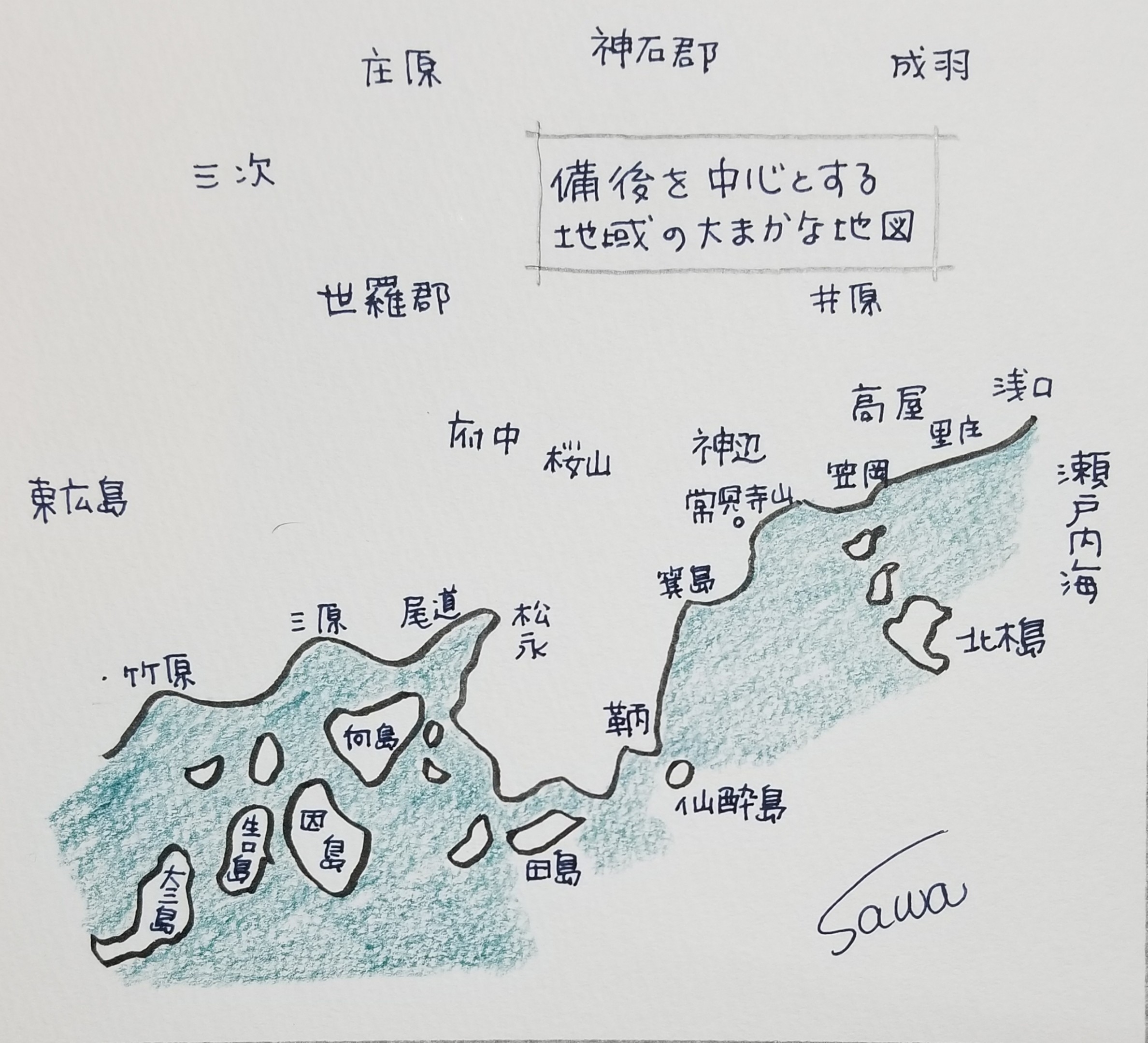 「備後」と呼ばれる地域の範囲は遠く飛鳥の頃から決まっている。西北に三次・府中(名の通り元の国府である)、北に神石高原(じんせきこうげん)・庄原(しょうばら)、南に瀬戸内海に面した三原・尾道・鞆(とも)、東寄りの内陸に神辺がある。神辺のさらに東には御領(ごりょう)と呼ばれる土地もあり、かつては荘園が点在していたことをうかがわせる。