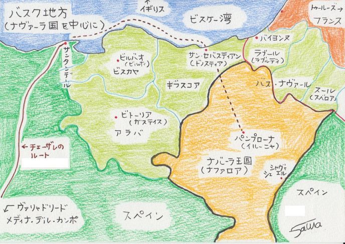 チェーザレ一行が進むのは真っ直ぐ北に進み、カンタブリアを越え東に折れる道である。そして横切る道はブルゴスからレオンへと東西に進む道である。横切る道はチェーザレ一行の道よりさらに細い。