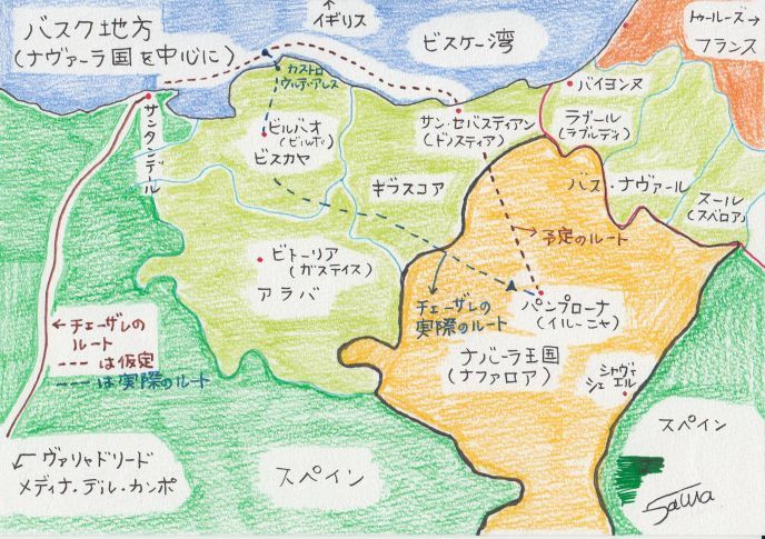 結局馬を調達できなかった2人は修道院でらばを3頭引き連れて戻った。その間に暖かい部屋で休んでいたチェーザレの熱はだいぶ下がっていた。あと2、3日休んだほうがよいと2人がすすめたが、すでにバスク地方に入ったと聞いたとたん、すぐにでも出発したいとチェーザレは言った。