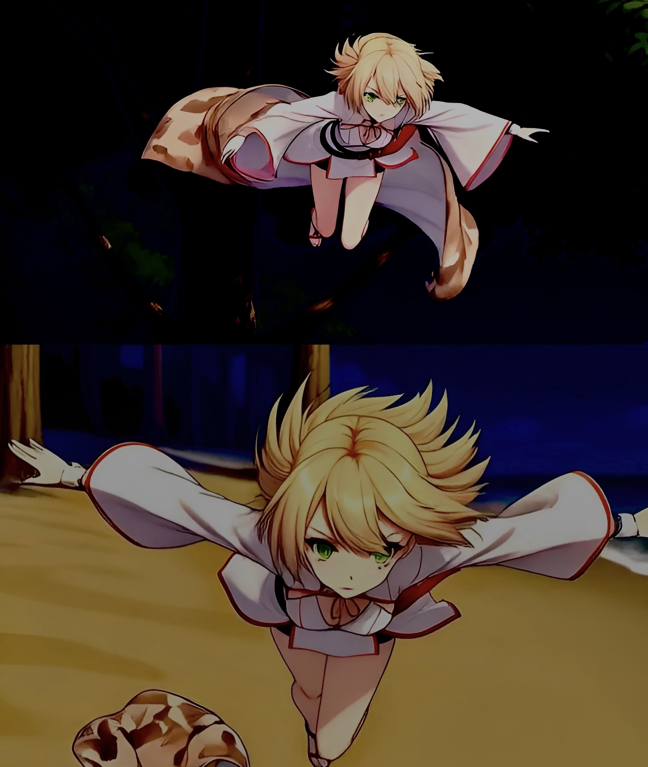 迷彩柄だった姿形が白いふわりとした萌え袖染みたどう見繕っても戦いに不都合な衣服へ様変わりする大胆不敵。金髪棚曳く天女が如き様。