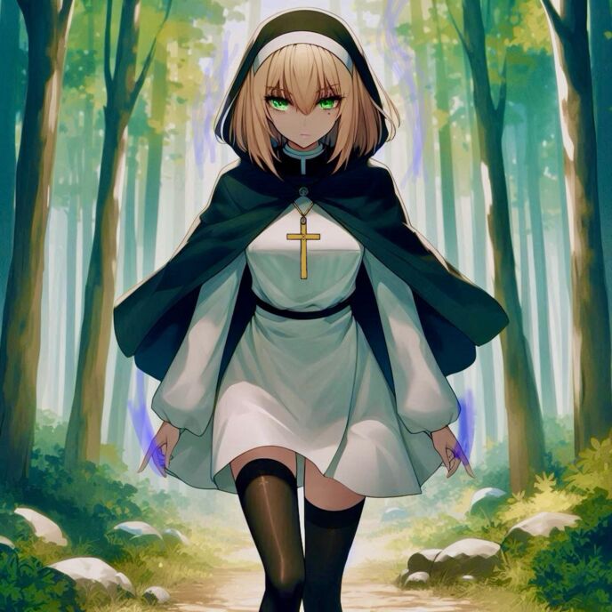黒いヴェールとマントを脱ぎ捨て相手に投げつけるルシア。カチューシャだけ頭に残し白一色の修道服に一瞬で着替えたその様は武道僧さながらといった処。