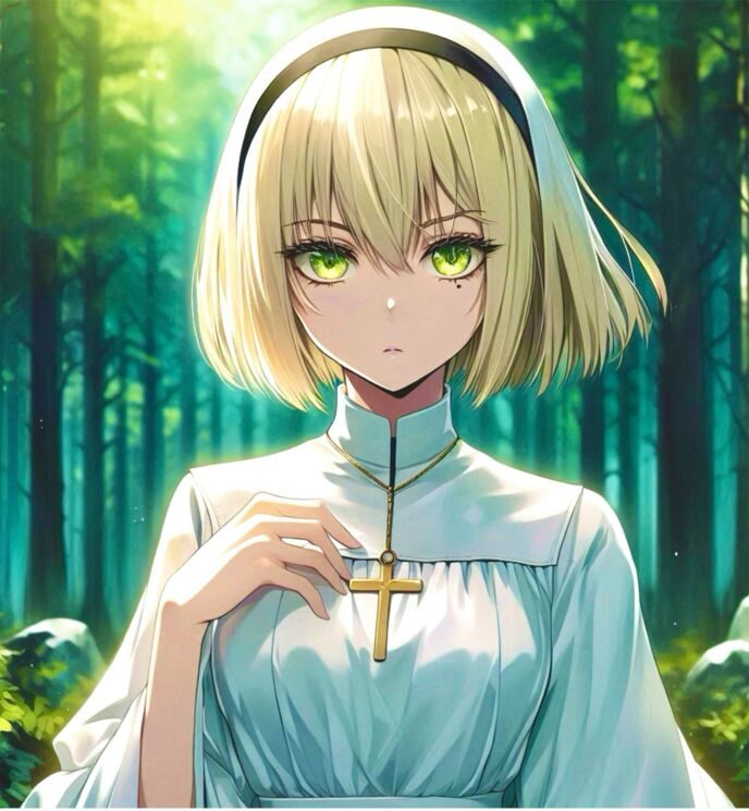 印を結んだ右手をガロウの胸元へ静かに置く神の代行者。エディウス神を自分に降ろして代わりに奇跡を行使するリイナ。