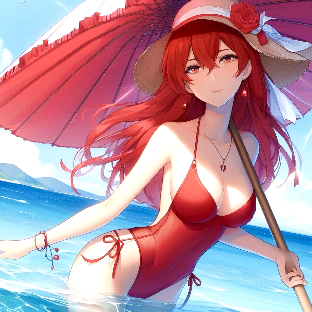 波間にそびえる岩陰から赤一色の影が現れ、膝上迄浸かった艶めかし過ぎる腿を曲がりくねらせ忍び寄る悪目立ち。