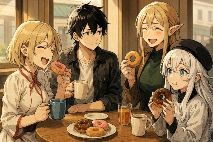 ドーナツ……未知の存在を感じ思わず揺らいだ。旅立ちは明日──にも関わらずドーナツ屋で人間の若者達と御茶会する自分を想像、縁遠き旅行思わせた。