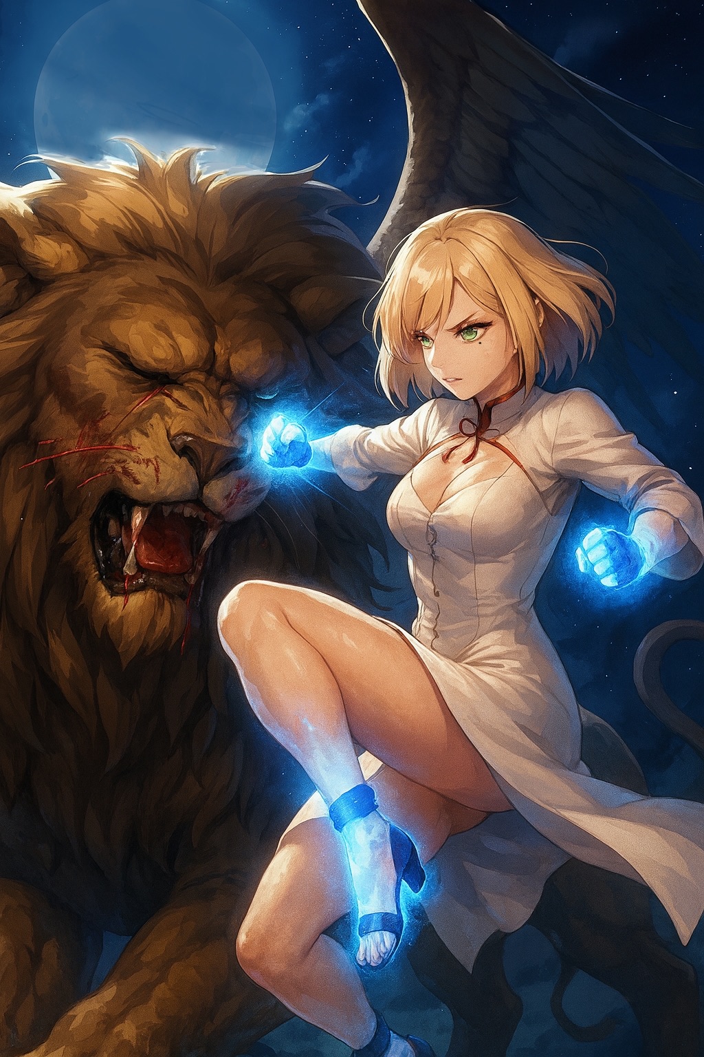 蒼白い光に染まる両手両拳を繰り出し、スフィンクスの横っ面をサンドバッグと成す。天女が如きルシアが宙舞う面目躍如。