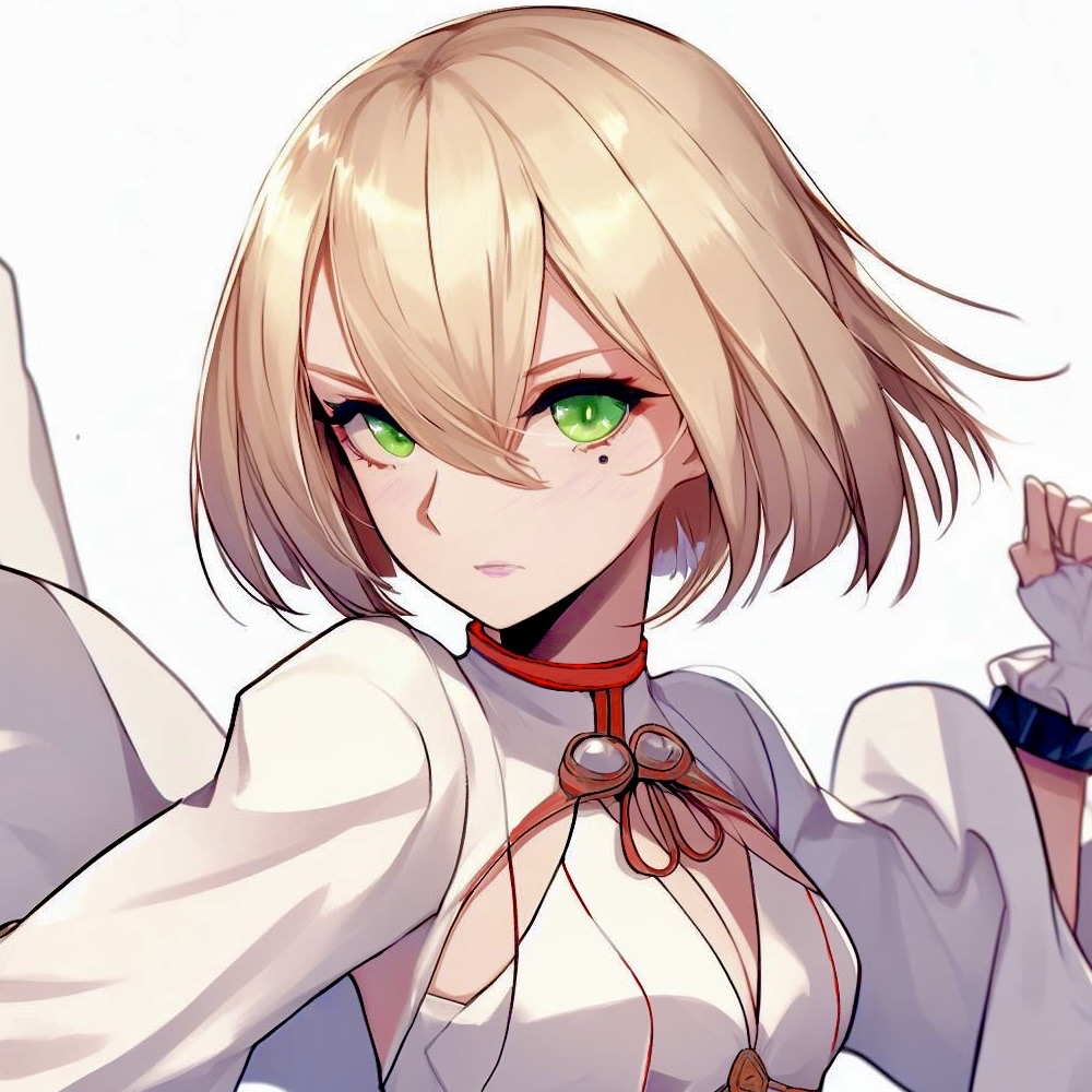 金髪ボブカット、天女が如き萌え袖な白い服装で精霊を付与した手足を振るう不思議な22歳女性。