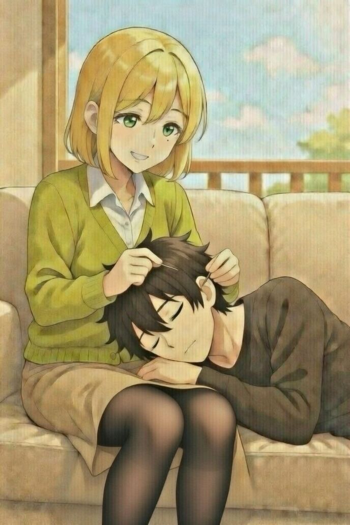 愛娘ヒビキの口癖を真似しつつ迷えるローダを導くルシアの愛情表現。加えて夫の頭を少し力を入れ自身の膝元へ倒した。