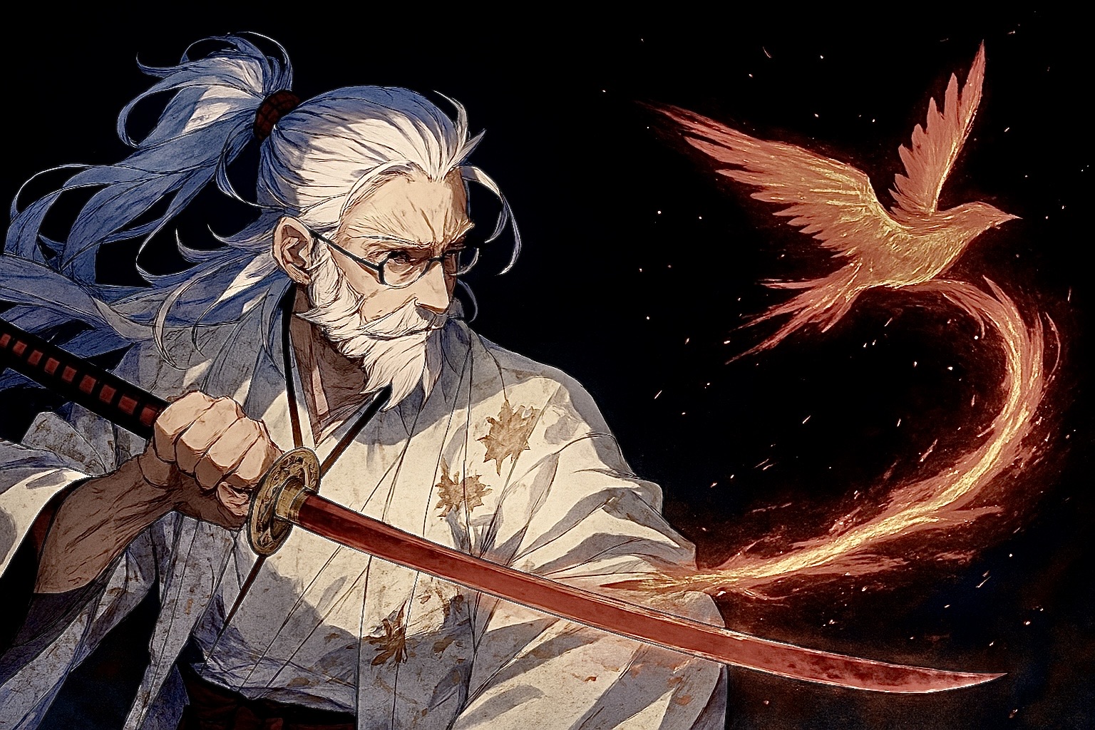 対する老人が朱塗りの鞘から取り出したるは紛れもない日本刀。まるで赤い鞘が熱していたのでは? そう勘繰りたくなる抜き身の色だ。