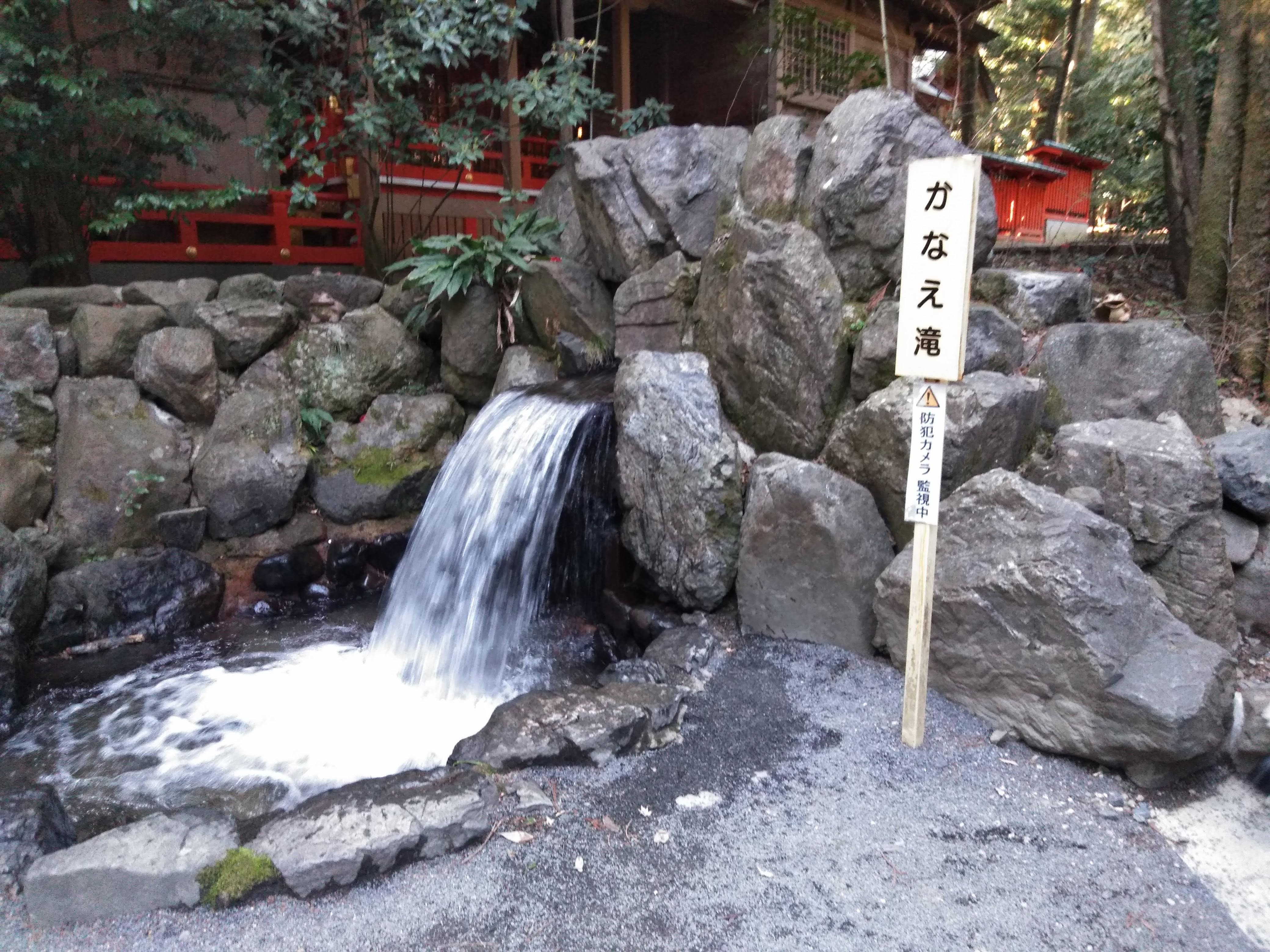 笑いながら説明する健の後ろについて広い境内を歩き、奥宮に着くと「長寿金龍の神水」が流れ出る「かなえ滝」に着いた。