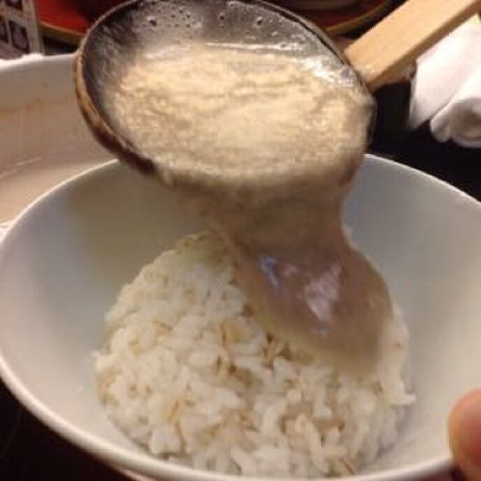 「少なめのご飯にたっぷりと自然薯をかけて、好みで薬味を乗せて、ご飯を泳がすように食べるんやで。?まんと味わうのもええからやってごらん。」