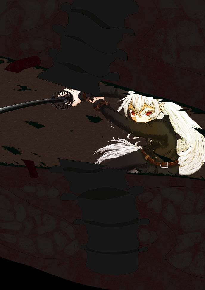 巨体のアンデッドがハンマー破壊の衝撃で無防備に胴体をさらしているところに、クロエは【影創造《クリエイト》】で一振りの刀を生みだした。それは真っ黒な刀身に真っ黒な鍔、真っ黒な柄と全体が黒まみれの打ち刀である。クロエは飛び出すように自身の左側に現れた鴉丸を、右側に半回転して右手でキャッチ。回転の遠心力を乗せた水平胴薙ぎの一刀にて、巨体のアンデッドの身体を真っ二つに切り伏せた。