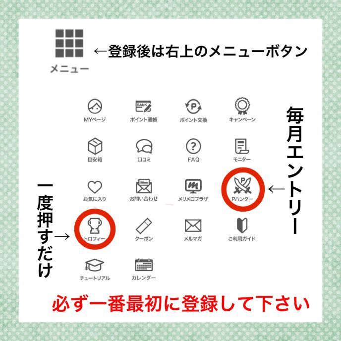 ポイントインカムは登録後、必ず最初にメニューボタンにある