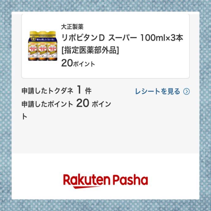 購入したリポビタンが楽天パシャにあって、さらに20ポイントGET(*´꒳`*)