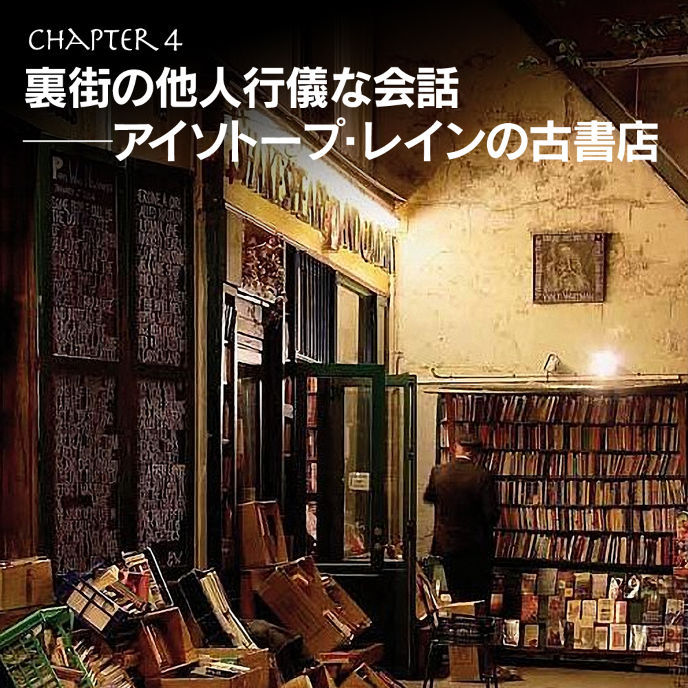 Rain's Booksはその路地を入った左側の古い煉瓦造りのビルの一階にある、こじんまりとした古書店だ。鰻の寝床のような細長く奥深い店内には古書が本棚に収まりつかず、床のそこここに積み上げられていた。外装の煉瓦造りに合わせたように、古びて黒ずんだ床材と天井が古色蒼然とした空気を醸し出している。蛍光灯はなく、曇った硝子にくるまれた電球が薄暗く灯り、一層古書店という雰囲気を際ださせていた。
