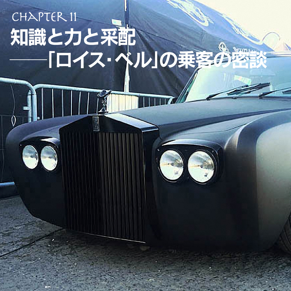 やがて詩音と由子の目の前に、全てのガラス部分にスモーク・シールドを施した漆黒の車体が滑るように止まる。ドアが六枚もあるリムジンだ。「影」を自在に行き来する全ての影で唯一の車体「ロイス・ベル」。片側三枚のガラス窓の一つが音もなく下に下がり、冷徹な狐目とポマードで固めた黒髪が覗く。まばらな口髭が動いた。