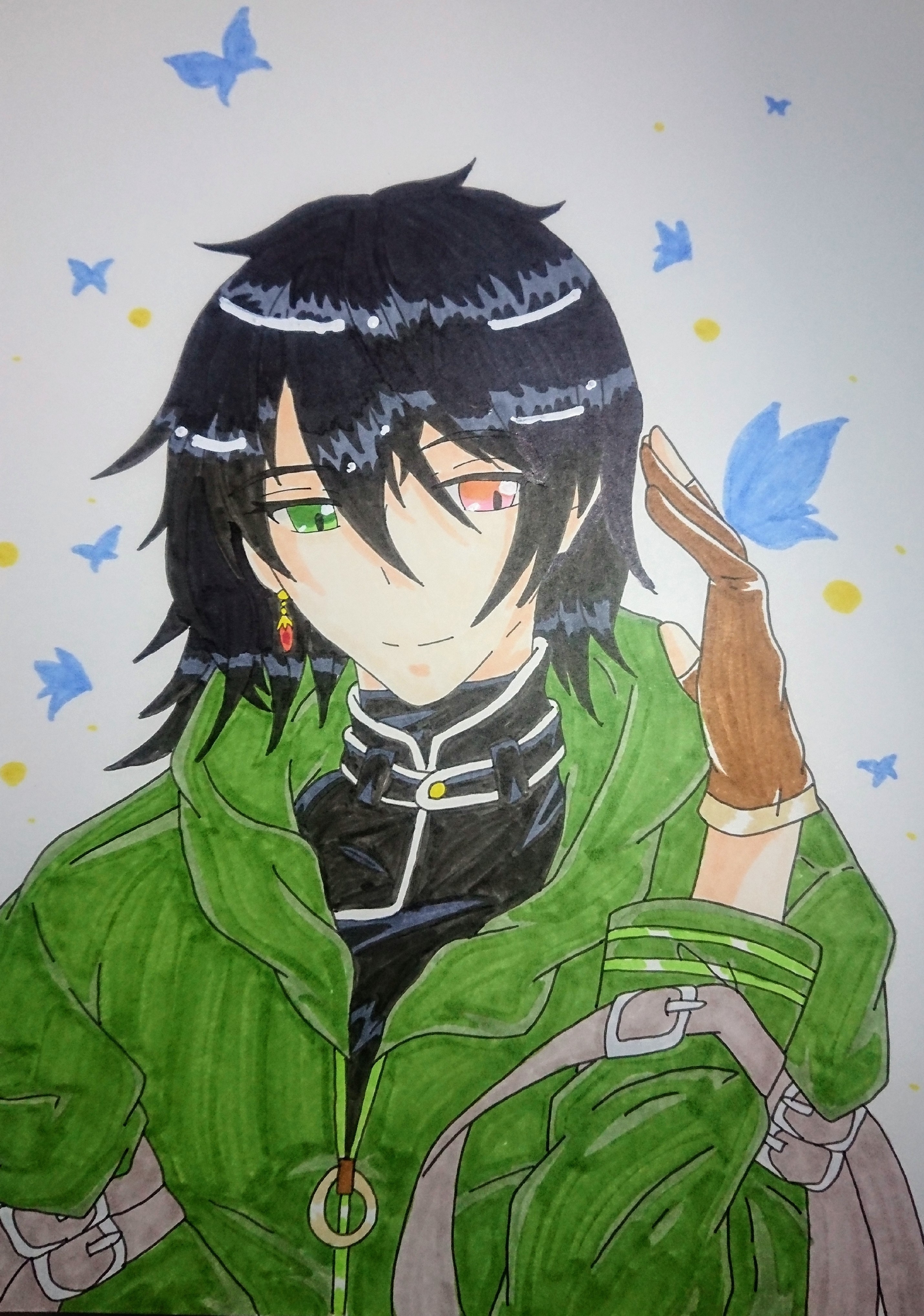 氷に映った姿は、黒色の髪色にロングウルフカットで長さが膝上ぐらいで尻尾は三つ編みにしてあり、細目にツリ目をした左目がショッキングピンクに右目が若葉色のオッドアイの瞳をして、右耳だけに紅い石が付いたイヤリングをしていて黒色の暗殺者用の軍服にモスグリーンのロングコートに二の腕や腰に合計六つの長いベルトを身に付けた服装をした青年だった。