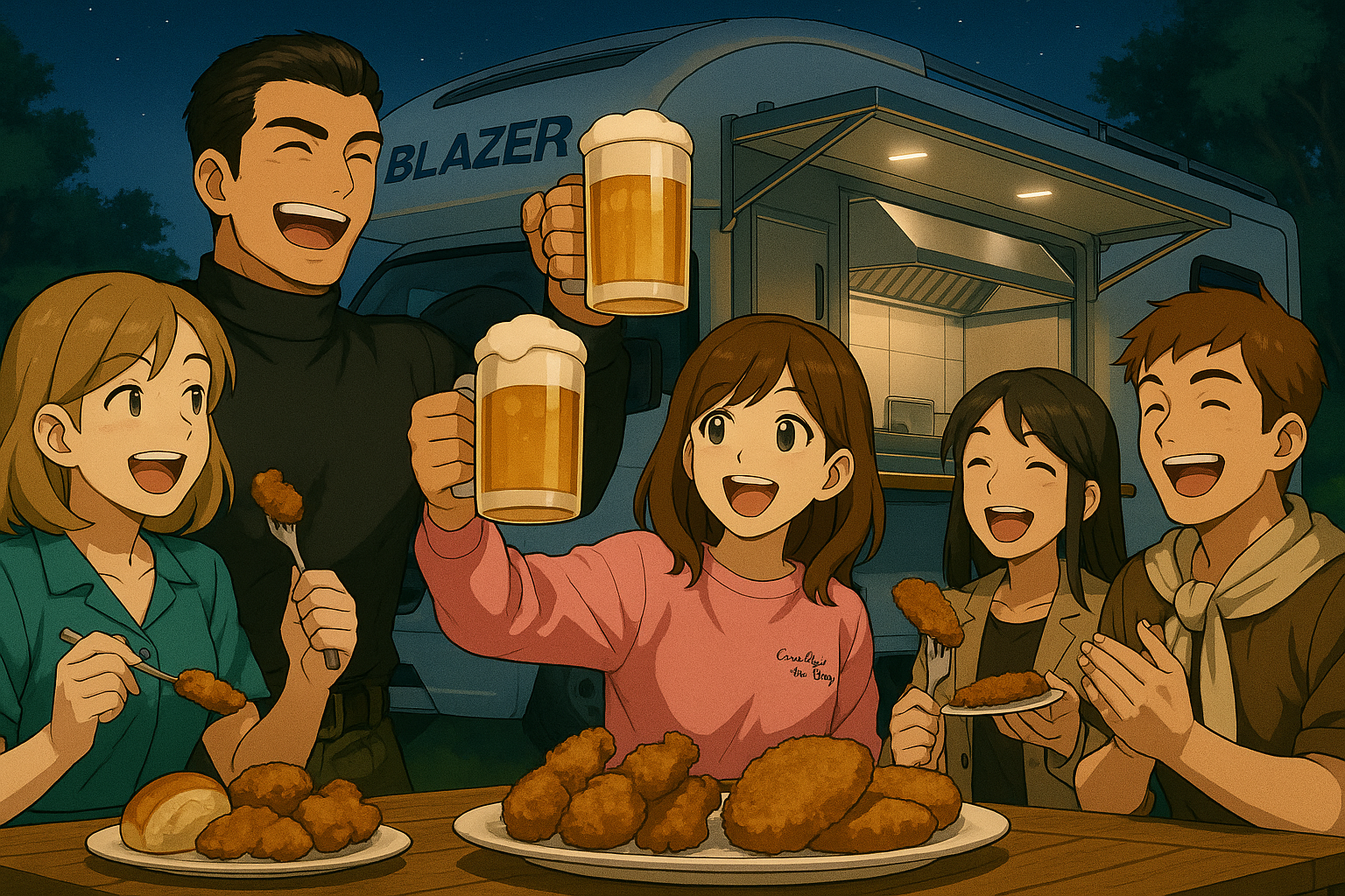 ブレイザーの外部キッチンで、五人は打ち上げをした。