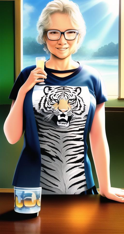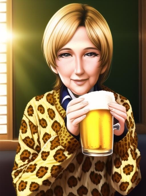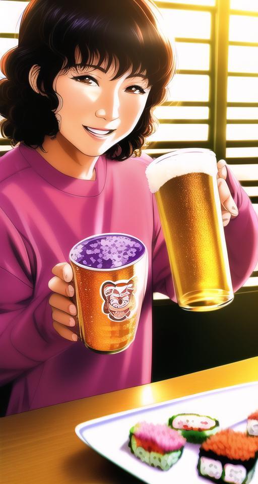 「お寿司食べながらビールを飲むパンチパーマで動物柄のトレーナーのおばさん」