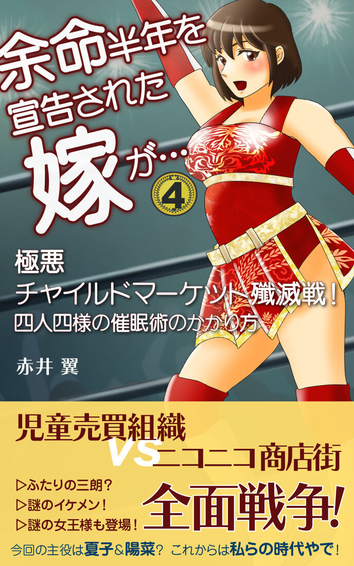 蒼井です。「余命半年を宣告された嫁が…④ 極悪チャイルドマーケット殲滅戦!四人四様の催眠術のかかり方」をキンドルアップしました。