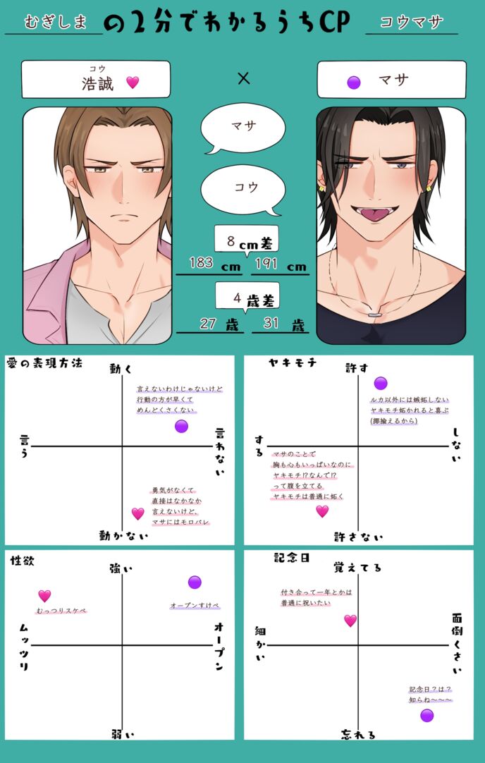 ※浩誠のイメージカラーはピンク、マサは紫です。Nova公式のカラー。