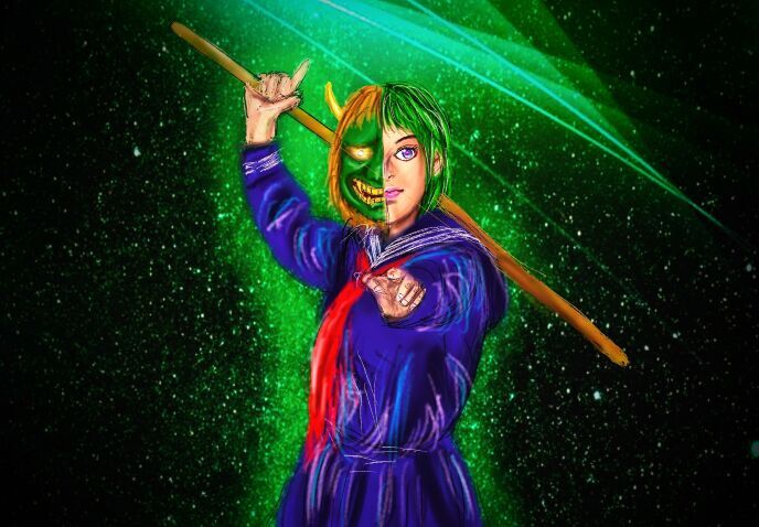スピーカーから無機質な声がそう告げると、男が繋がれている前の部屋の右壁の扉から一人の大柄な女が出て来た。女は片手に竹刀を持ち、床にバシバシと叩きつけながら大股で男の元に寄って行く。昭和のスケバン風のスカート丈の長いセーラー服を着ており、顔には緑の鬼の面を着けていた。