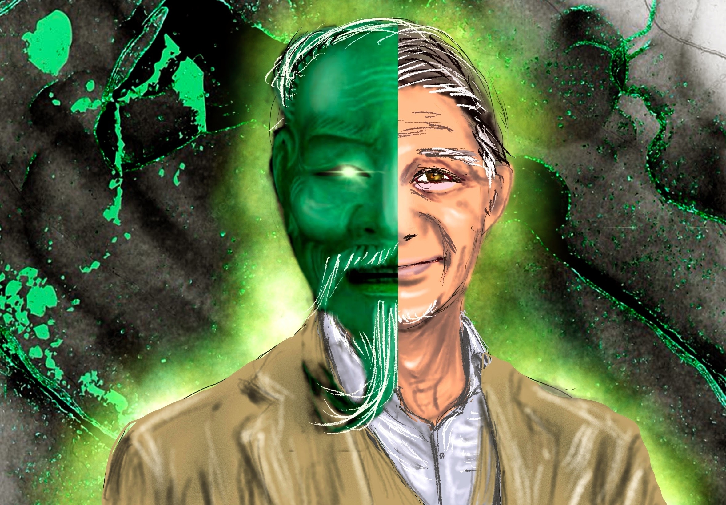 柳沢はそこまで考え至り、脱力して眼下のホールで繰り広げられる惨劇を見守った。まるでアリーナ席で観劇しているように観ていた面々も、一人、また一人と階下に降りていく。やがて全てが終わり、黒田が緑色の液体の中に完全に埋没すると、最後まで部屋に残っていた翁の面の男が柳沢に近づいた。翁面を取り、白髪の顔を柳沢の耳元に寄せる。