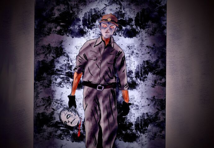 襟口の上にあるはずのものが無い。にも関わらず、両手を前に伸ばし、ゆっくりとこちらに歩を進めて来るのだ。さらにその後方、社務所の裏側の陰に、二つの目が光っている。ドール人形のように精巧な顔の少女のアーモンド形の目が、さっきまでのあどけなさとは全く異質の、歪んだ笑みを張り付かせて首の無い駐在の奥で佇んでいる。そしてさらには……