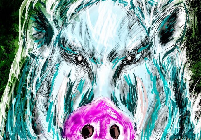 隊員たちが笑い、一人が頭を撫でようと手を出す。猪はその手にカプっと噛み付く。おわっと隊員が手を引っ込め、少し後退った時、猪の鳴らすくぐもった喉の音が次第に腹の底に響くような重低音に変わっていく。あろうことか、猪の身体がみるみる大きくなっていく。あれあれと言ううちに横幅が1メートルほどにもなり、完全に庭の奥への道を塞いでしまった。