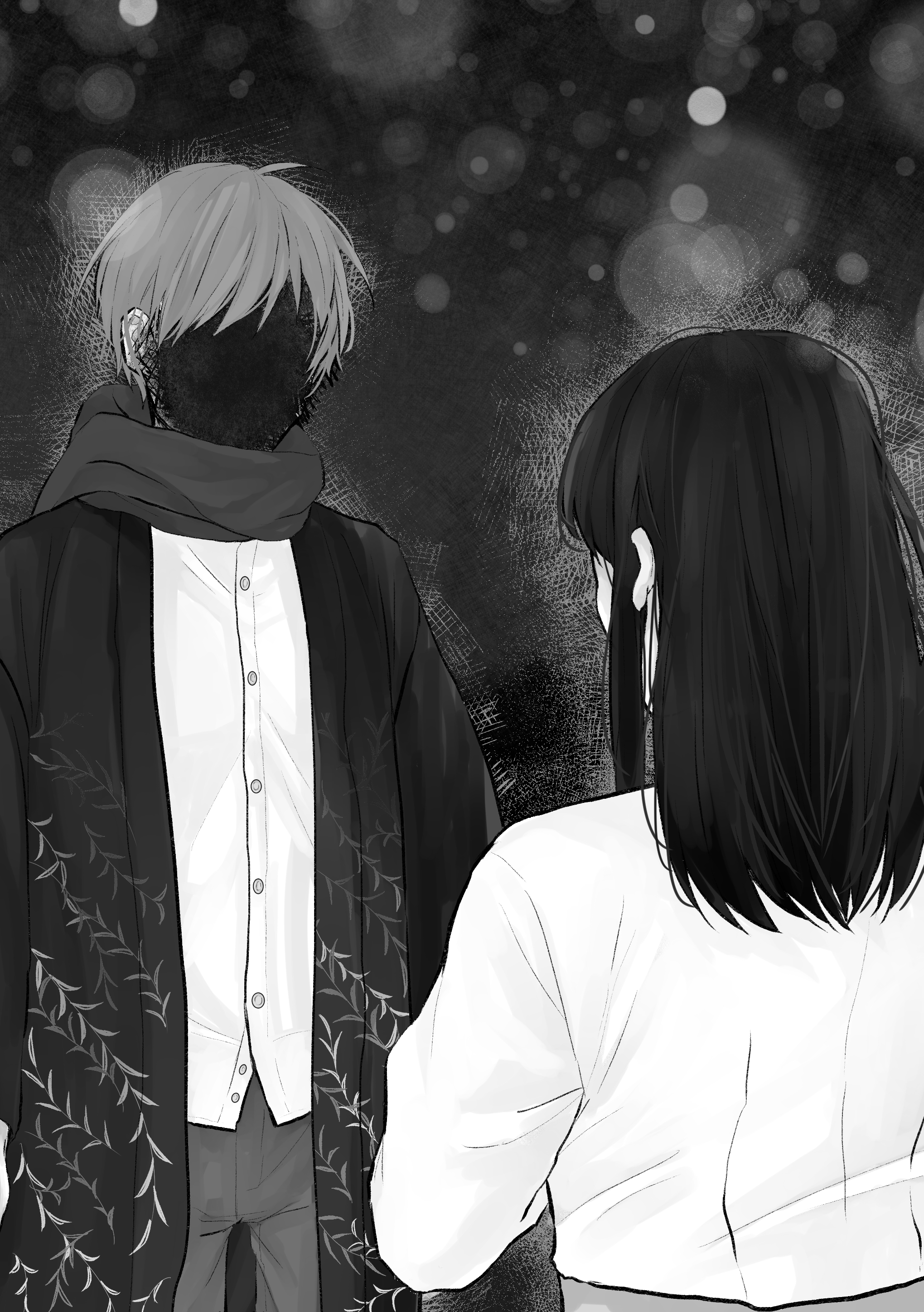 赤いマフラーを巻き、真っ白なシャツを着て黒地に柳が描かれた着物を羽織っている。しかし、その顔はまるで墨で塗りつぶされたかのように黒く見えなかった。