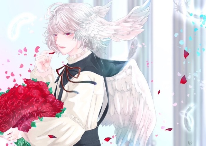 天使の象徴である真っ白な羽を背にし、キューピットの矢の代わりに真っ赤なバラを手にしている。