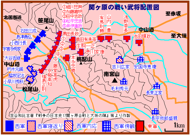 三成の盟友大谷吉継は藤川台に布陣し、その数およそ千五百。西軍中最大の一万七千の軍勢をほこる宇喜多秀家は、南天満山に五段構えの陣を敷く。小西行長は北天満山を背に約四千の軍勢をもって布陣し、その左手に島津隊が約千五百の軍勢をもって陣どった。そして東山道の南松尾山には、小早川秀秋の部隊一万五千ほど、その麓に脇坂安治・赤座直安等の諸隊約四千二百が布陣した。