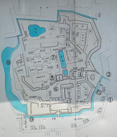 同じ頃、旧幕府軍の別動隊は、城の北東の後背高地の法華寺という寺の境内に布陣。ここは城の本丸より高台に位置した。ここからまず城郭外の砲陣地を大砲で破壊。さらに城内を破裂弾で攻撃する。これによってついには火災が発生した。