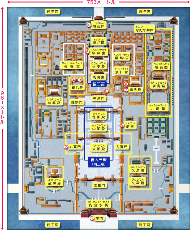 高さ十メートルの厚い城壁に囲まれ、四面に各一門、四隅に角楼を設け、その外に幅五十メートル余の堀をめぐらしている。この中に九千近くの部屋があり、明代では九千人の宮女、それに宦官十万人が住んでいたというから驚嘆のほかない。