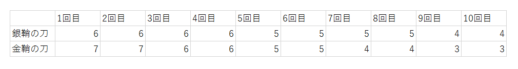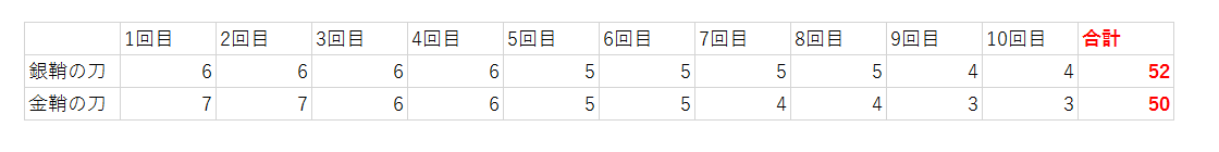 1刀目、銀鞘の刀は、6,6,6,6,5,5,5,5,4,4