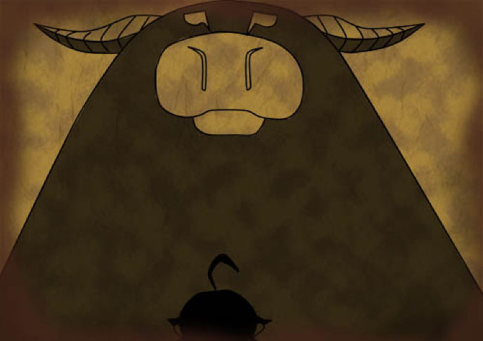 数十年か数百年か寝続けていたある日。何かに引っ張られた気がして牛は目を覚ましました。