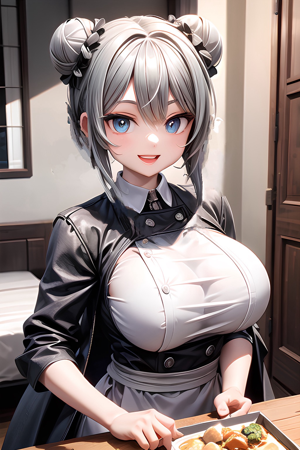 料理をテーブルに置いた彼女は、勢いよくベッドへと飛び込み、ユーリのすぐ前へと着地した。その衝撃で、コックコートを押し上げる巨大な双丘が、ぶるん! と勢いよく跳ねる。