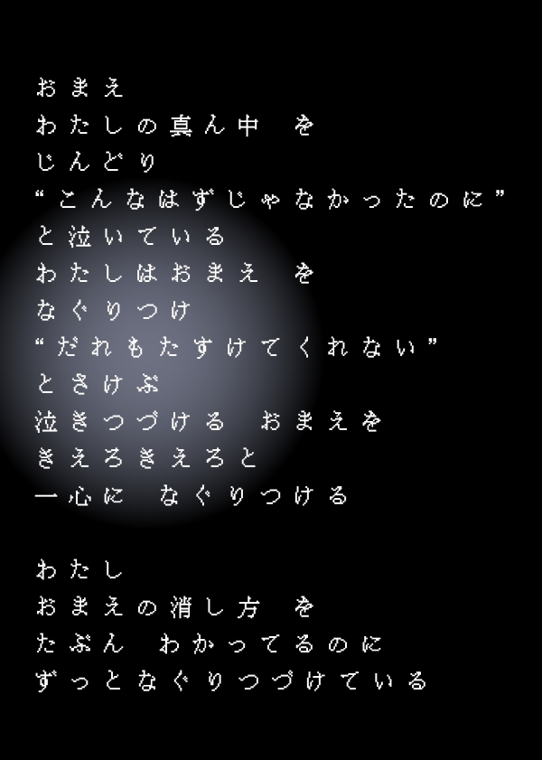 何か、とても気がかりなものがあるとき、目をつむっても、ずっとそれは見えているような感覚におちいります。消えるようにいくら念じても、ずっとはりついて剥がれてはくれません。耳鳴りがするくらいに静かな夜は、それを剥がす方法を、じっと考えています。けれどそうして思い付いたことを、私はまだ実行できずにいるのです。